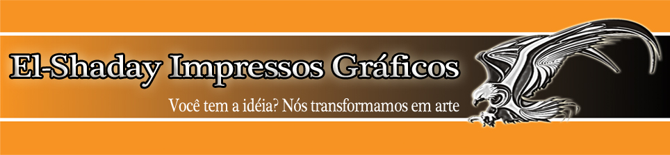 Olá Sejam Bem vindos a Elshaday Impressos Gráficos, aqui você acha em um só lugar tudo o que você precisa para a sua Empresa e apresentação de seu produto, ou trabalho, a nossa política é de oferecer o que tem de melhor no mercado, em matéria de impresso gráficos, com qualidade, ótimo preço, e no prazo combinado. Se não acharem o que procuram, entre em contato, que buscaremos uma solução para os sua idéa,Tenha certeza que faremos um ótimo negócio.